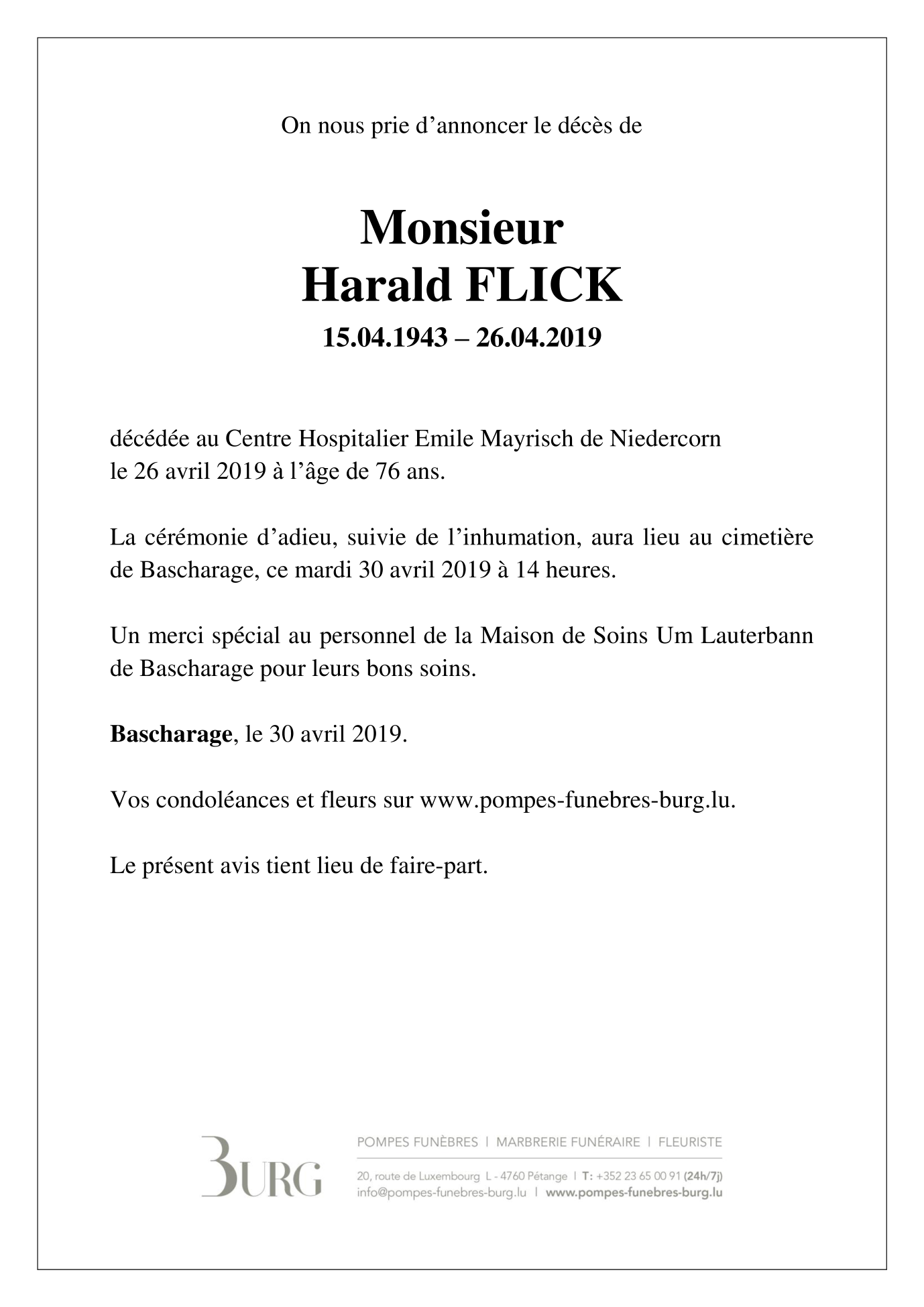 Décédé à Petange/Niederkorn  (4762, Luxembourg) le vendredi 26 avril 2019 à l'âge de 76 ans