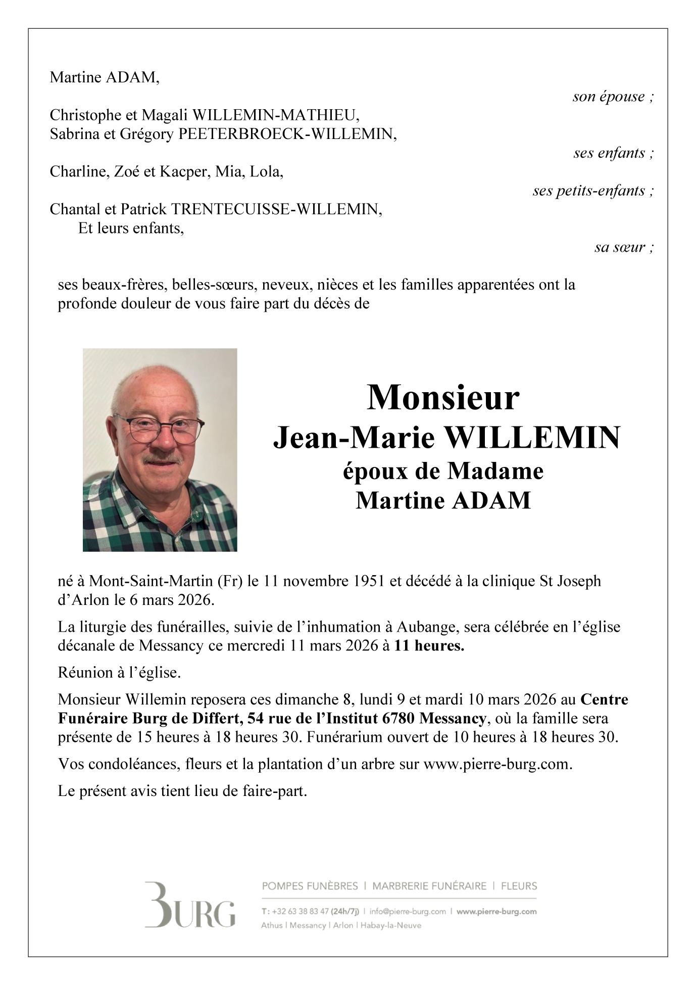 Décédé à Arlon (6700) le vendredi 6 mars 2026 à l'âge de 74 ans