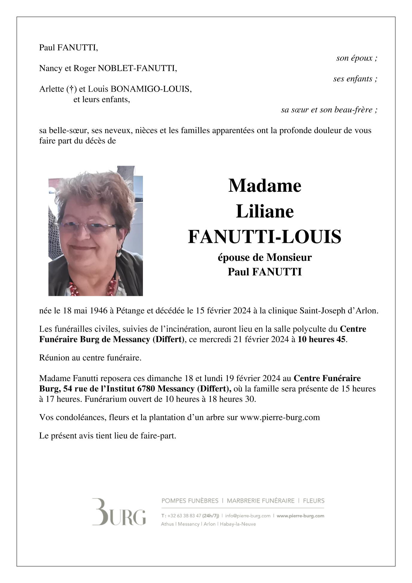 Décédée à Arlon (6700) le jeudi 15 février 2024 à l'âge de 77 ans