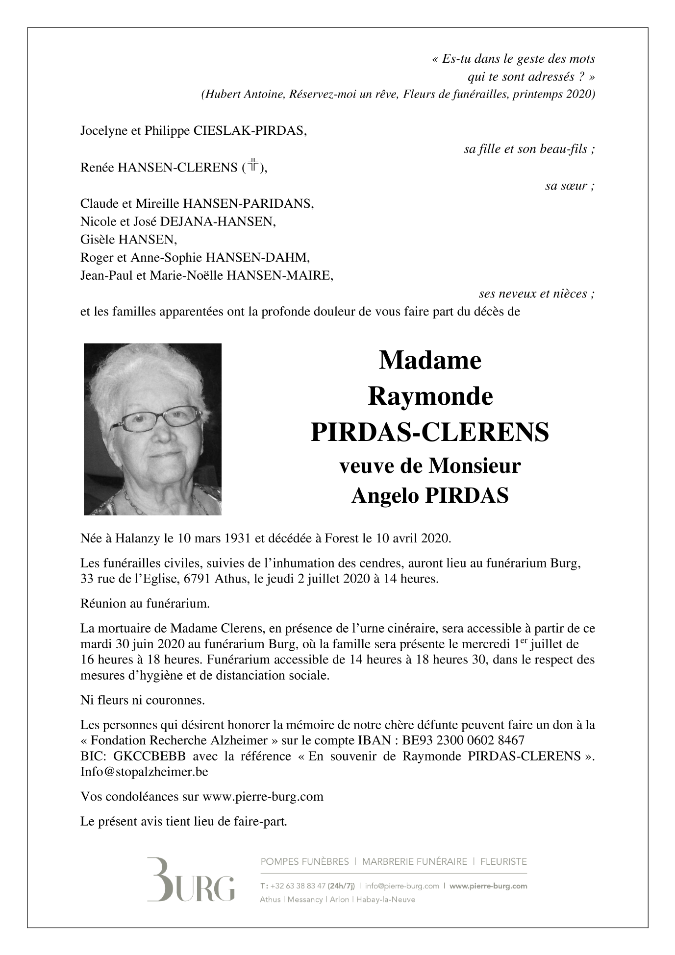Décédée à Bruxelles (Forest) (1190) le vendredi 10 avril 2020 à l'âge de 89 ans