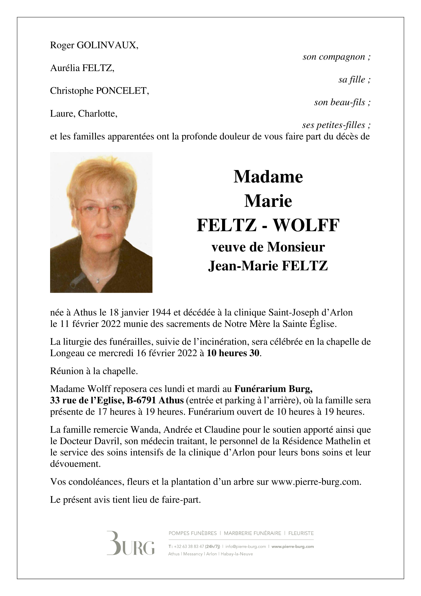 Veuve de Monsieur Jean-Marie FELTZ