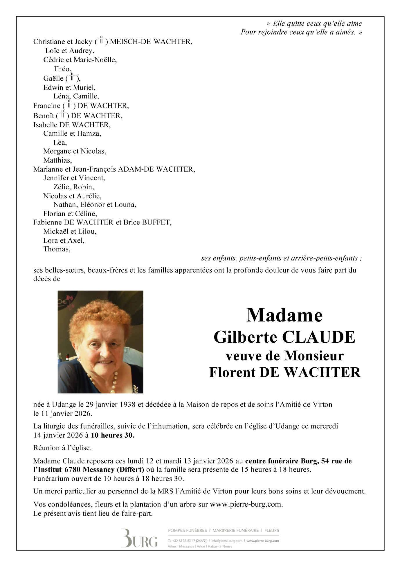 Décédée à Virton (6760) le dimanche 11 janvier 2026 à l'âge de 87 ans