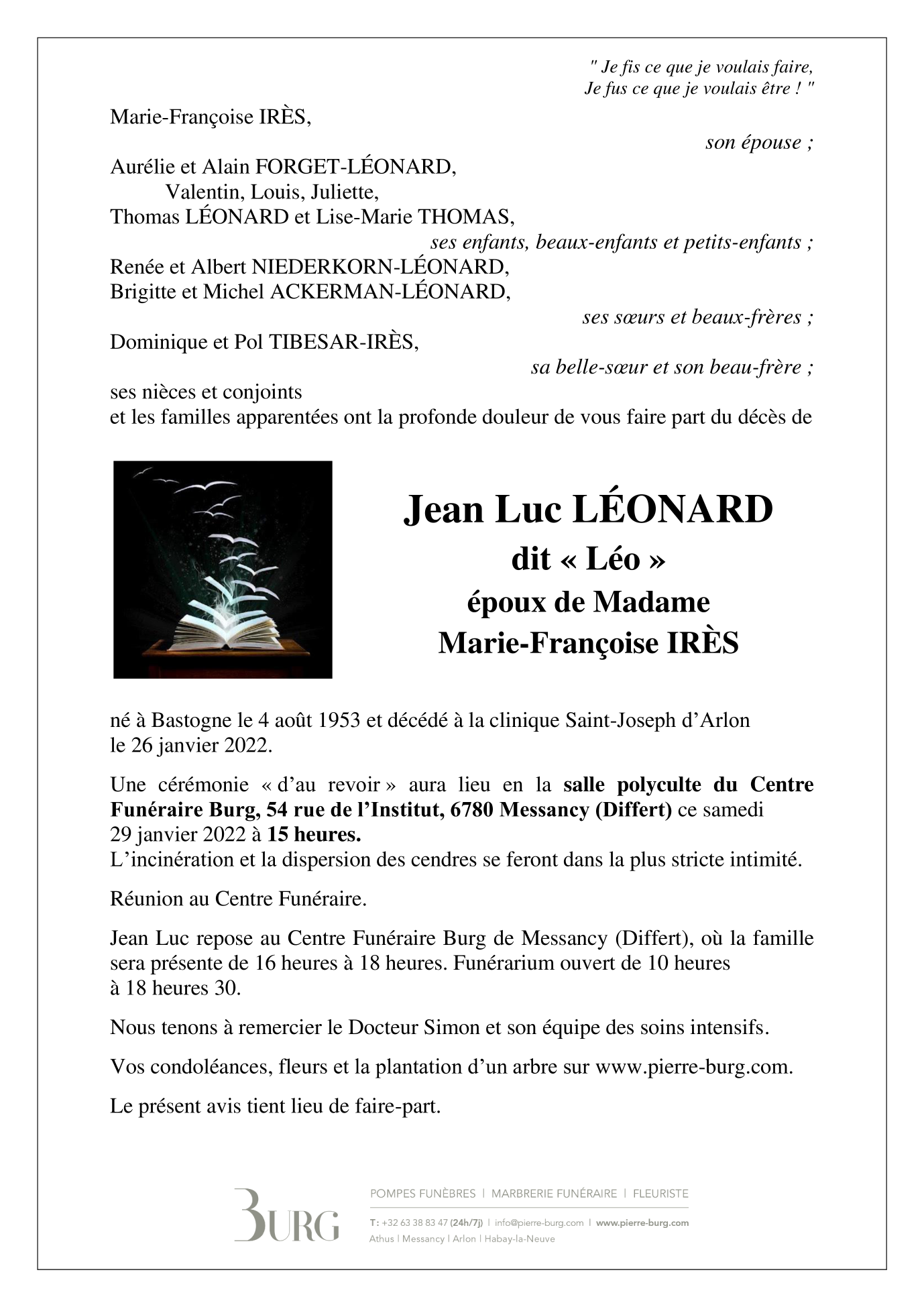 Décédé à Arlon (6700) le mercredi 26 janvier 2022 à l'âge de 68 ans
