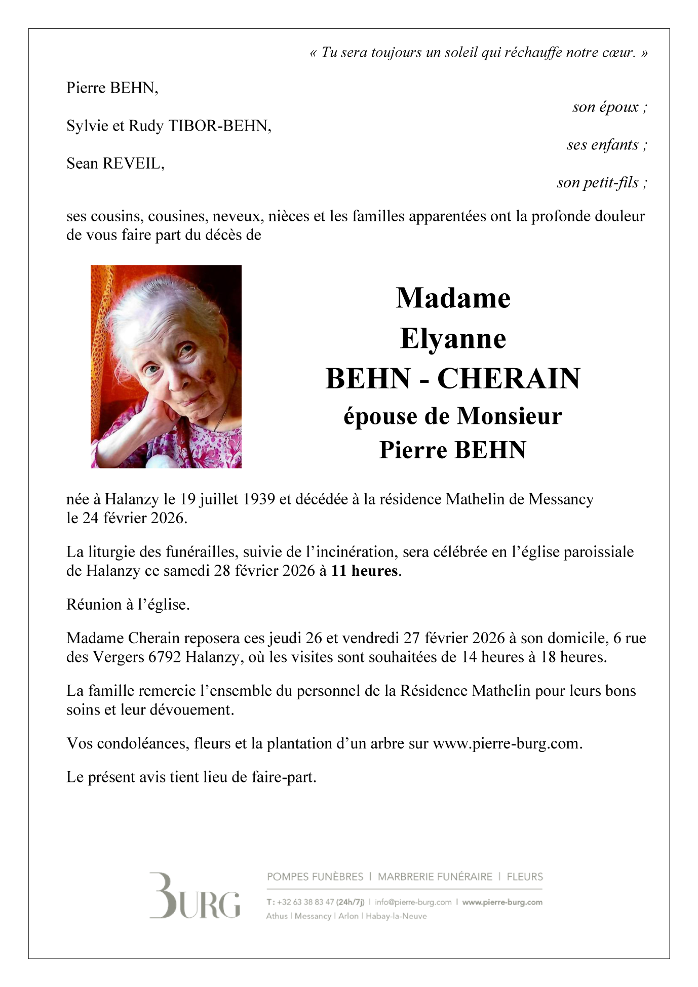 Décédée à Messancy (6780) le mardi 24 février 2026 à l'âge de 86 ans