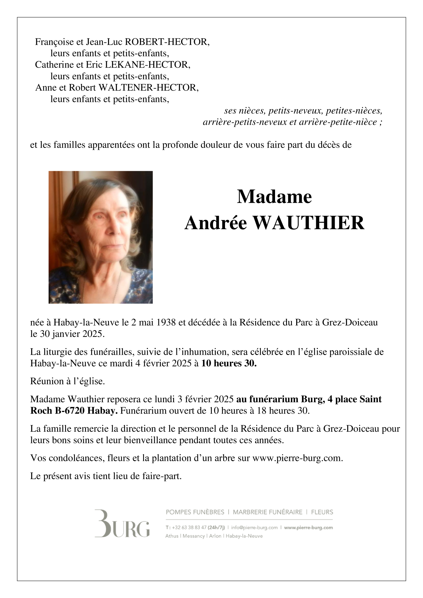 Décédée à Grez-Doiceau (1390) le jeudi 30 janvier 2025 à l'âge de 86 ans